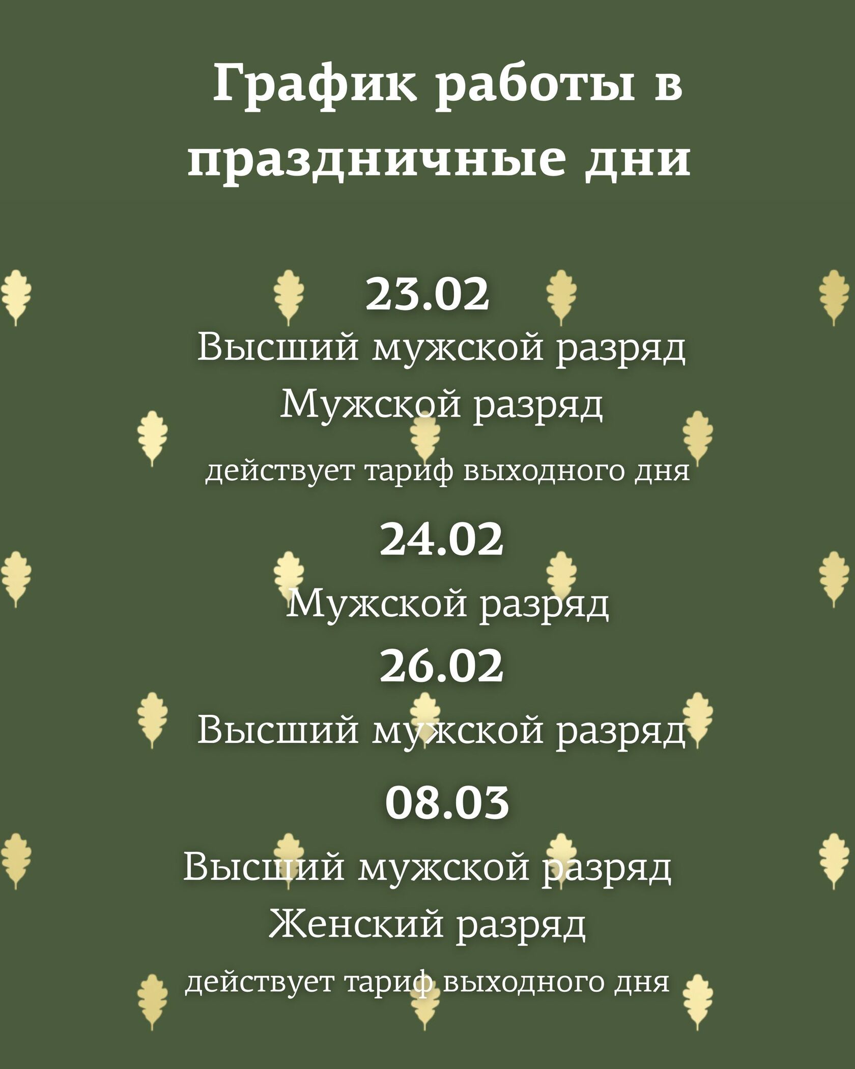 Дорогие гости, просим вас обратить внимание на изменения в расписании! В некоторые дни меняются разряды и действуют тарифы выходного дня.